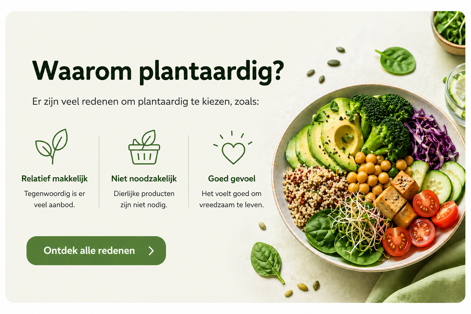 kies plantaardig want dierlijke producten zijn niet nodig en een gevarieerd plantaardig dieet verlaagt zelfs je kans op ziekten